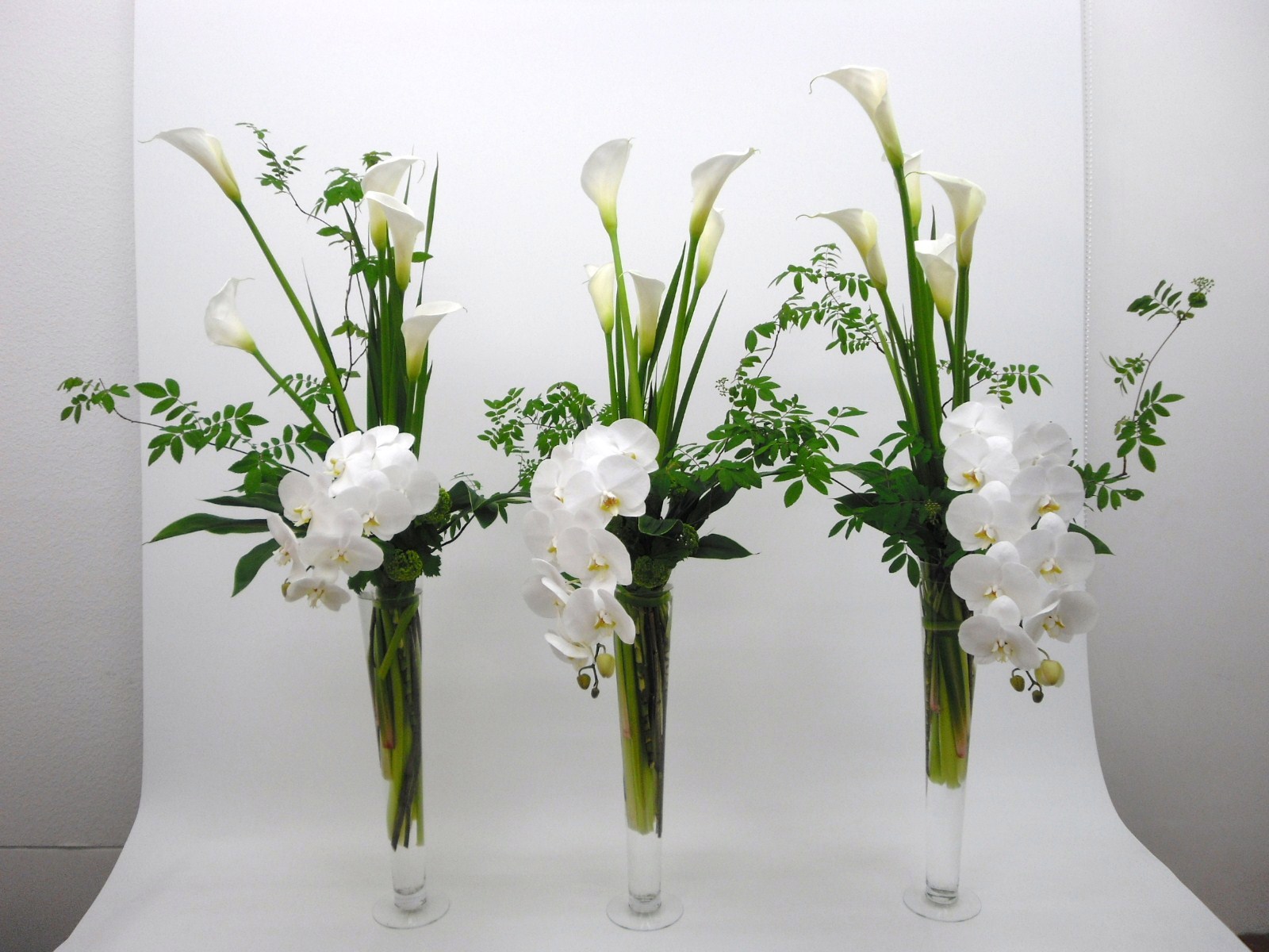 店舗がガラス張りの高級焼肉店さんのオープンお祝に。胡蝶蘭を入れて高級感を出し、通路に置くので横長になるよう3つ並べて一つの作品にしています。花器は回収してお花のみの代金を頂いております。