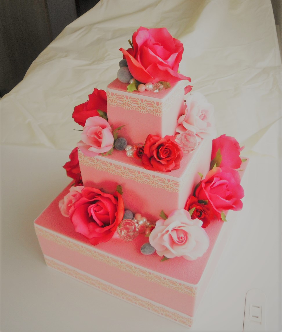 ピンクのスポンジ(オアシス)に造花をアレンジしています。受付のディスプレイに。