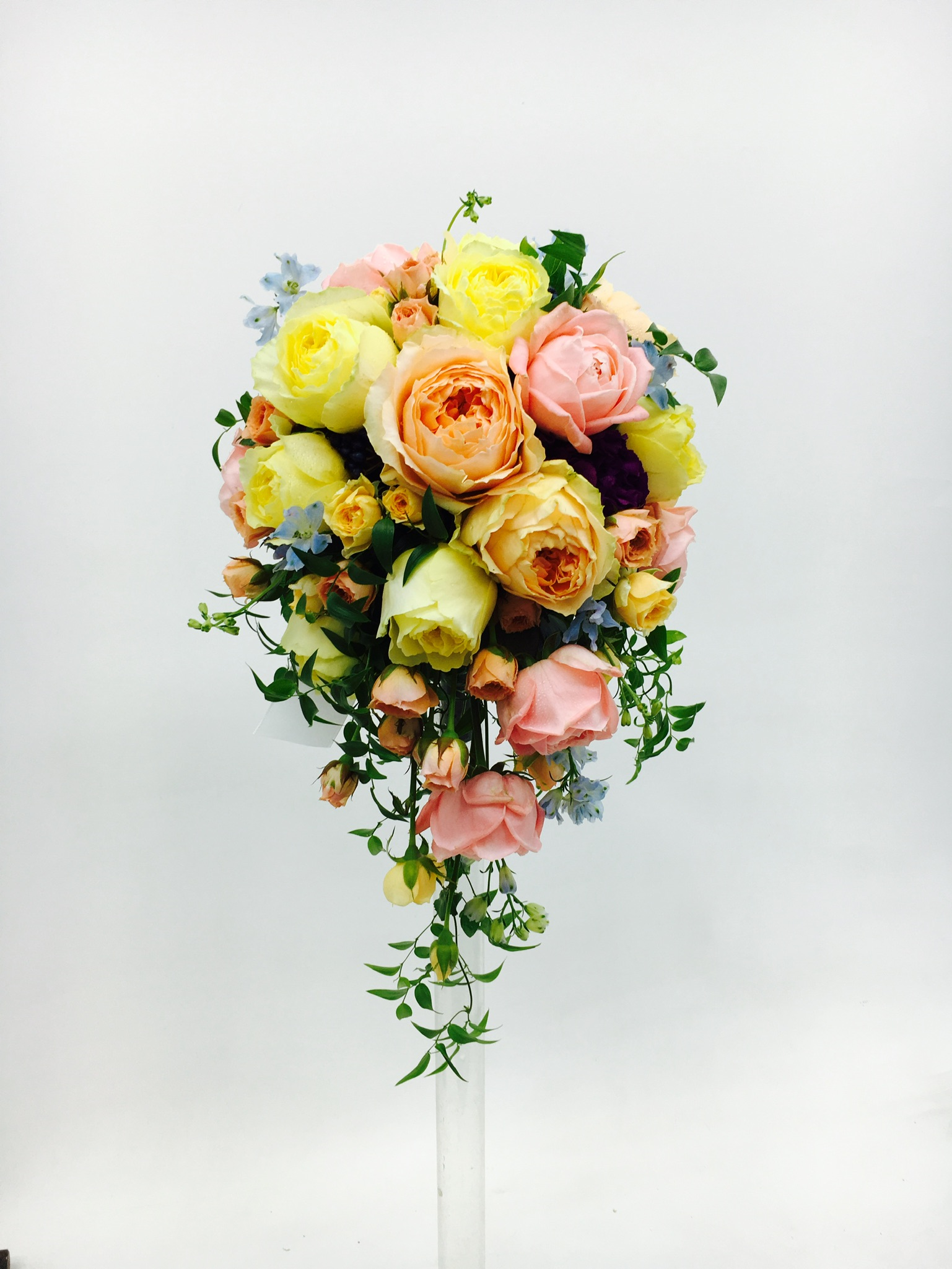 生花のブーケ。市販のウェディングカタログから選ばれたブーケの色合いで形を変えて。隣の県に宅急便で発送しました。(3月)