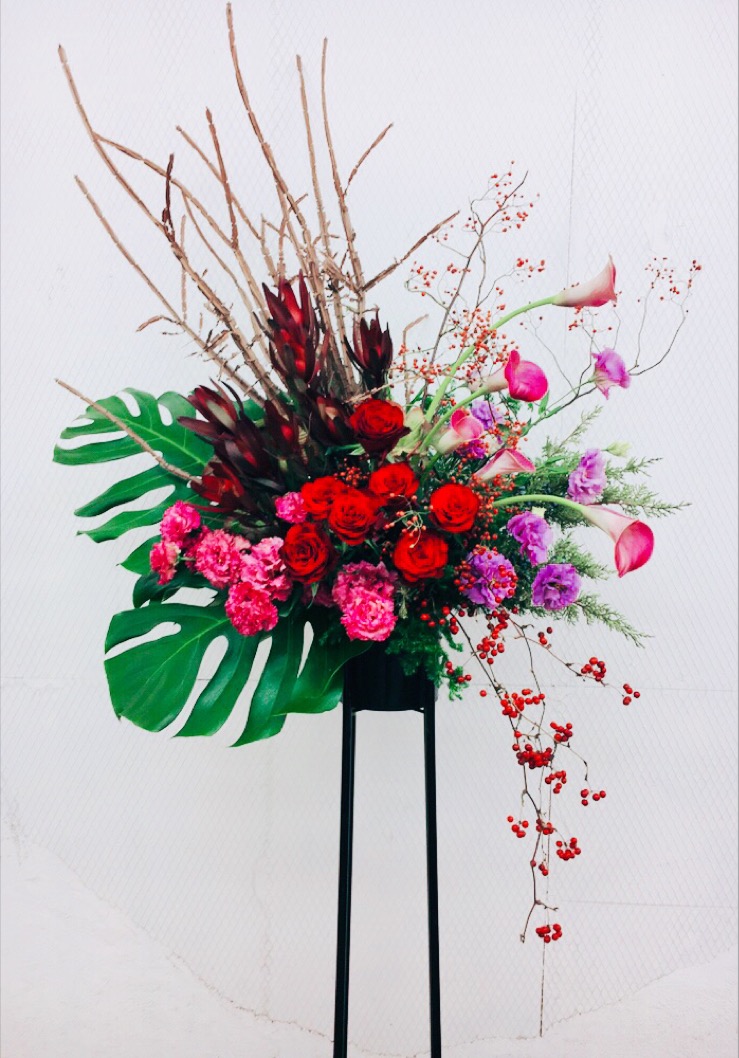 美容室の開店お祝に、赤でカッコ良いイメージというご要望。ご予算上たくさんの花が入らないのでデザイン重視で花の量が気にならないようにしました。