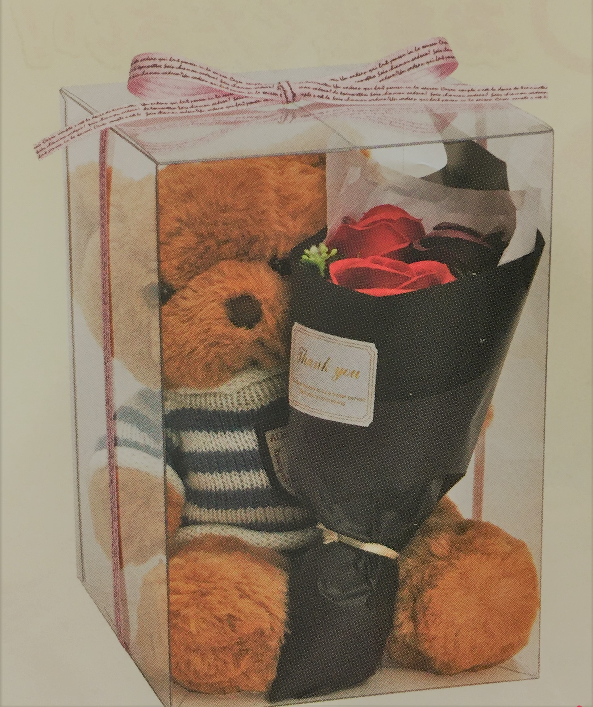 ケース入り。ベアは4種類の中から、ブーケは7色のフェアリーブーケの中から選び、組み合わせは自由です。
